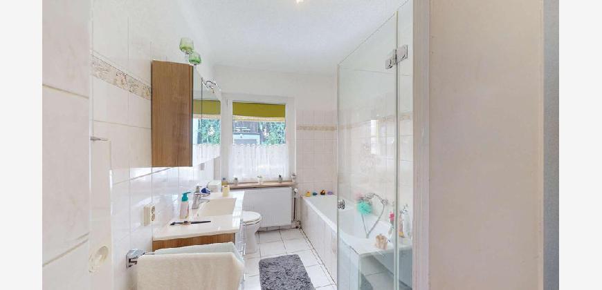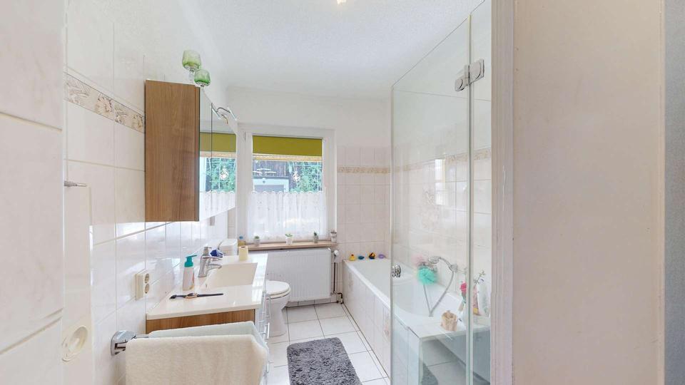 Im Erdgeschoß gelangen Sie durch den sehr hell und freundlich gestalteten Flur in die modern eingerichtete Küche, ein Wohnzimmer mit Blick auf das liebevoll angelegte Grundstück, ein Gästezimmer sowie ein großes Badezimmer mit Dusche und Badewanne.