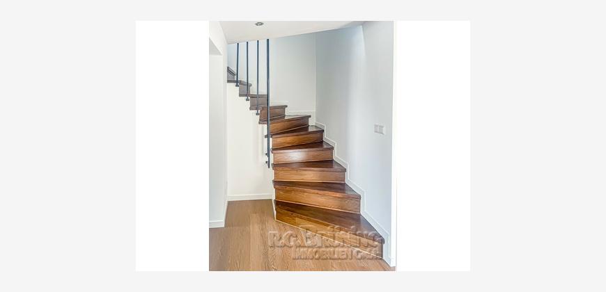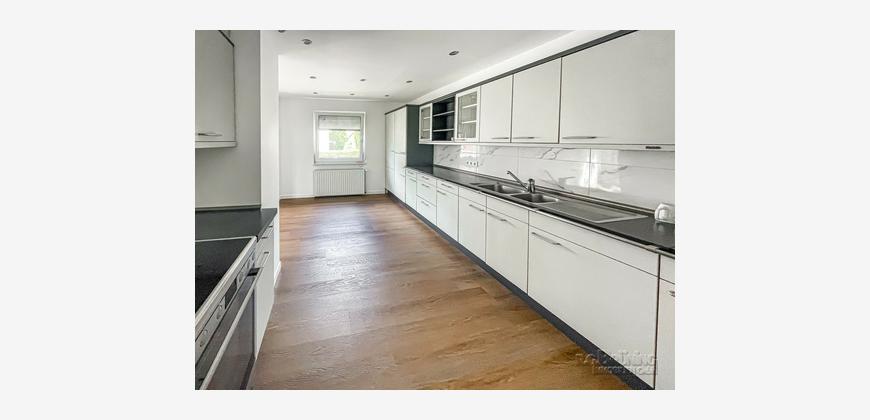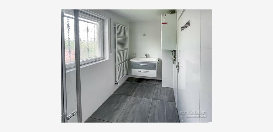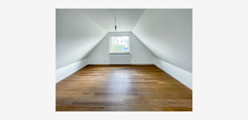 Das Erdgeschoss besteht aus einem großen Wohn-Esszimmer mit Schwedenofen, einer geräumigen Küche mit Einbauküche, dem Badezimmer mit separatem WC und einem großzügigen Schlafzimmer.