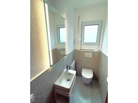 Badezimmer und Gäste-WC: beide mit Fenster, luxuriöse Ausstattung mit namhaften Armaturen und formschönen Objekten, Dusche bodeneben mit Glastrennwand, Doppelwaschbecken/Waschbecken (Gäste-WC) mit funktionellen Unterschrank und großen Spiegelschrank mit Lichtkonzept.