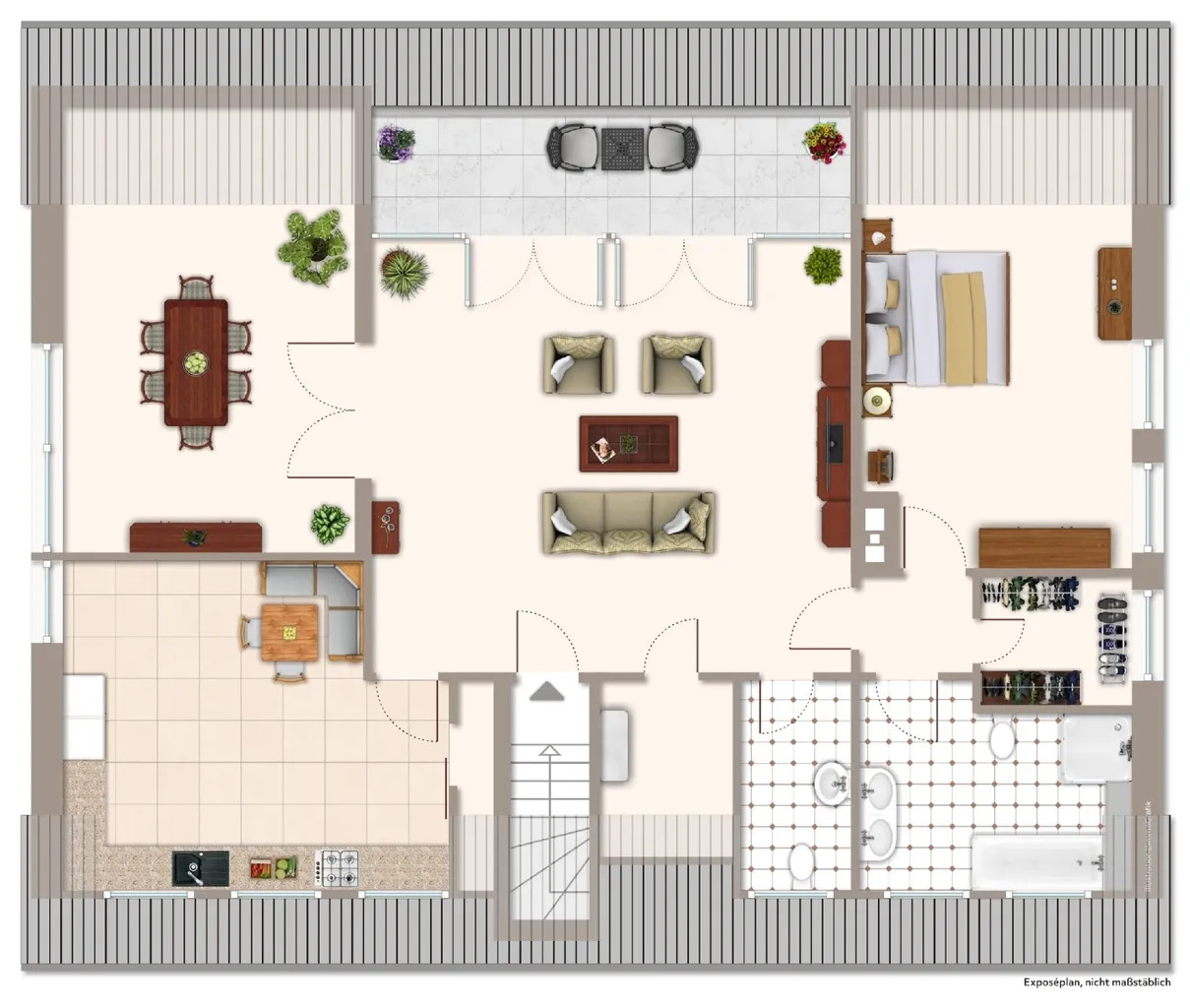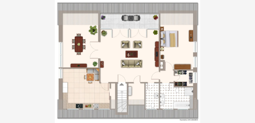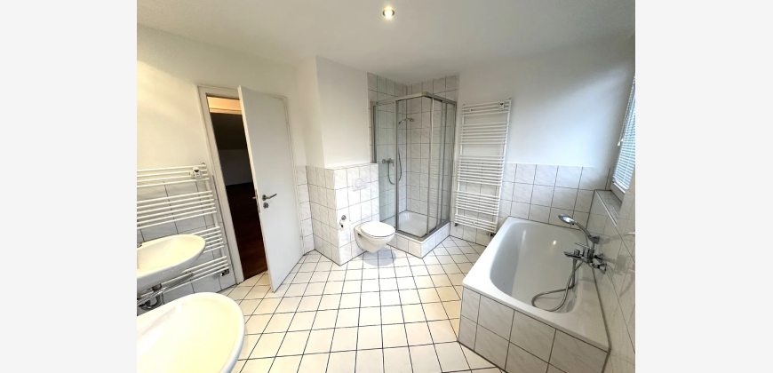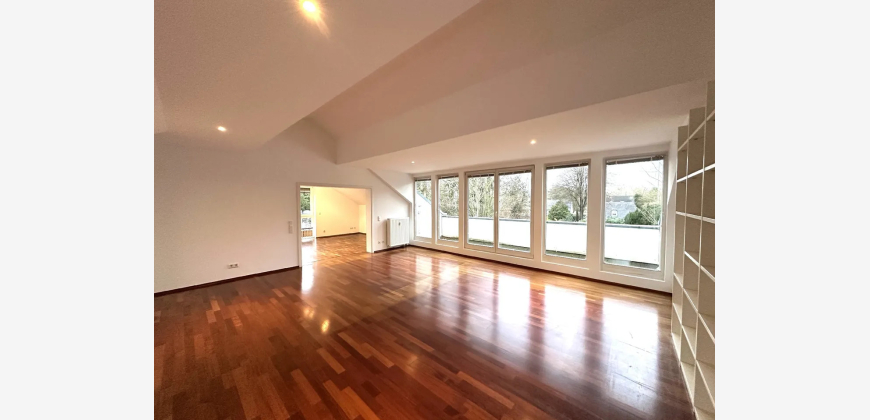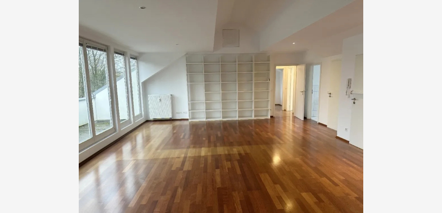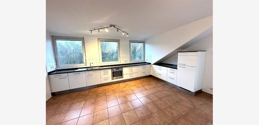 Die Dachgeschosswohnung wurde vor einigen Jahren komplett neu erstellt. Es entstand auf ca. 130 m² Wohnfläche eine 3-Zimmer-Wohnung mit einem Schlafzimmer, einem großen Wohnzimmer mit süd-westlich ausgerichtetem Balkon sowie einem Esszimmer. Die Küche ist vom Wohnzimmer aus begehbar, ebenfalls großzügig dimensioniert und mit einer modernen, weißen Einbauküche ausgestattet. Das Bad wurde weiß gefliest, verfügt über Wanne und Dusche und - wie auch das Gäste-WC - über ein Fenster.