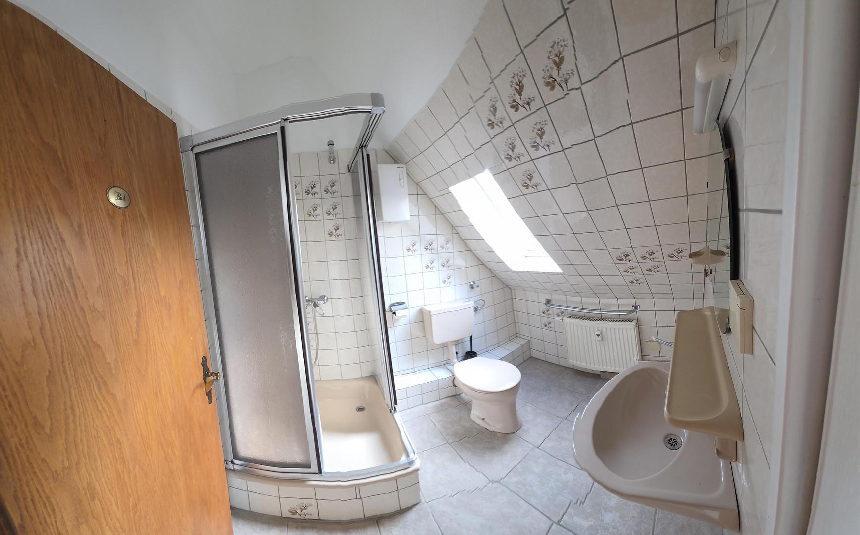 Badezimmer mit Dusche, Waschtisch und Toilette.