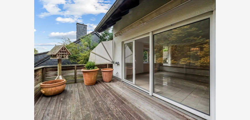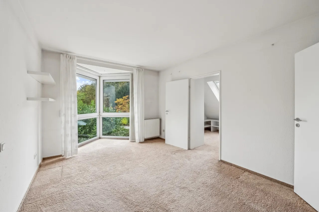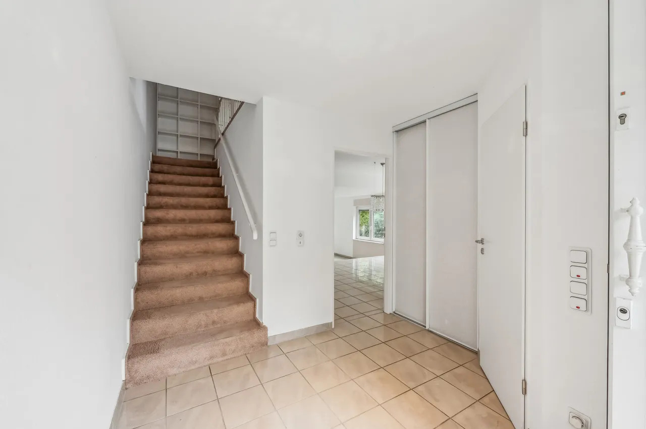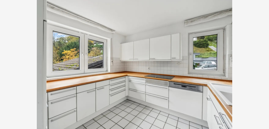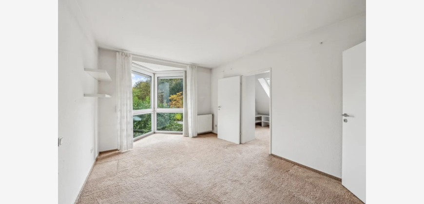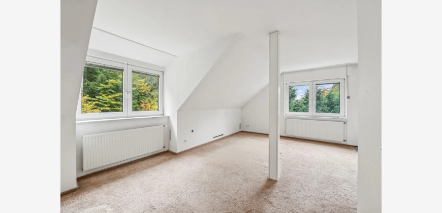 Diese Immobilie bietet eine tolle Raumaufteilung mit Wohnkomfort durch Blick ins Grüne. Schon beim Betreten des Wohnbereichs, welcher über einen großzügigen Flur erreichbar ist, wird man durch bodentiefe Fenster und die angrenzende Terrasse von diesem Blick überzeugt. Der groß geschnittene, offene und helle Wohn- und Essbereich bietet Platz für die ganze Familie. Die angrenzende Küche der Marke Poggenpohl ist zusätzlich mit hochwertigen Elektrogeräten der Marke Neff ausgestattet. Helle Fliesen runden das Gesamtbild im Erdgeschoss ab. Im Dachgeschoss verbindet ein Flur alle weiteren Räume. Dazu zählt auch das große Badezimmer, welches sowohl eine Dusche als auch eine Badewanne bietet. Dieses Badezimmer, und auch das Gäste-WC im Erdgeschoss, sind mit Tageslichtfernstern ausgestattet. Die anderen Räume können beispielsweise als Kinder- und Schlafzimmer genutzt werden. Auf dieser Etage ist außerdem Teppichboden verlegt. Im Untergeschoss befindet sich ein weiterer beheizter Raum mit Teppichboden, welcher problemlos als Büro genutzt werden kann. Im Heizungsraum nebenan befindet sich zudem die Sauna. Die Fenster im gesamten Haus und die Heizung stammen aus dem Baujahr des Hauses (1991). Außerdem ist eine Fußbodenheizung verlegt. Im Dachgeschoss bietet ein Dachspeicher zusätzlichen Stauraum, wobei die Decke für ideale Energieeffizienz gedämmt ist. Das Inventar wird durch ein zusätzliches Entgelt in Höhe von 10.000,00 € als Aufschlag auf den Kaufpreis berechnet. Dazu zählt: - eine Infrarotlichtsauna - Einbauschränke der Marke Interlübke - Einbauküche mit Elektrogeräten u. a. von Marken wie Miele und Neff