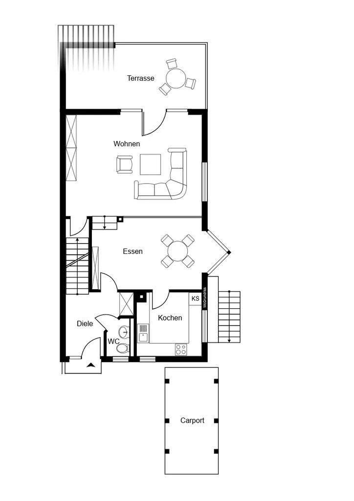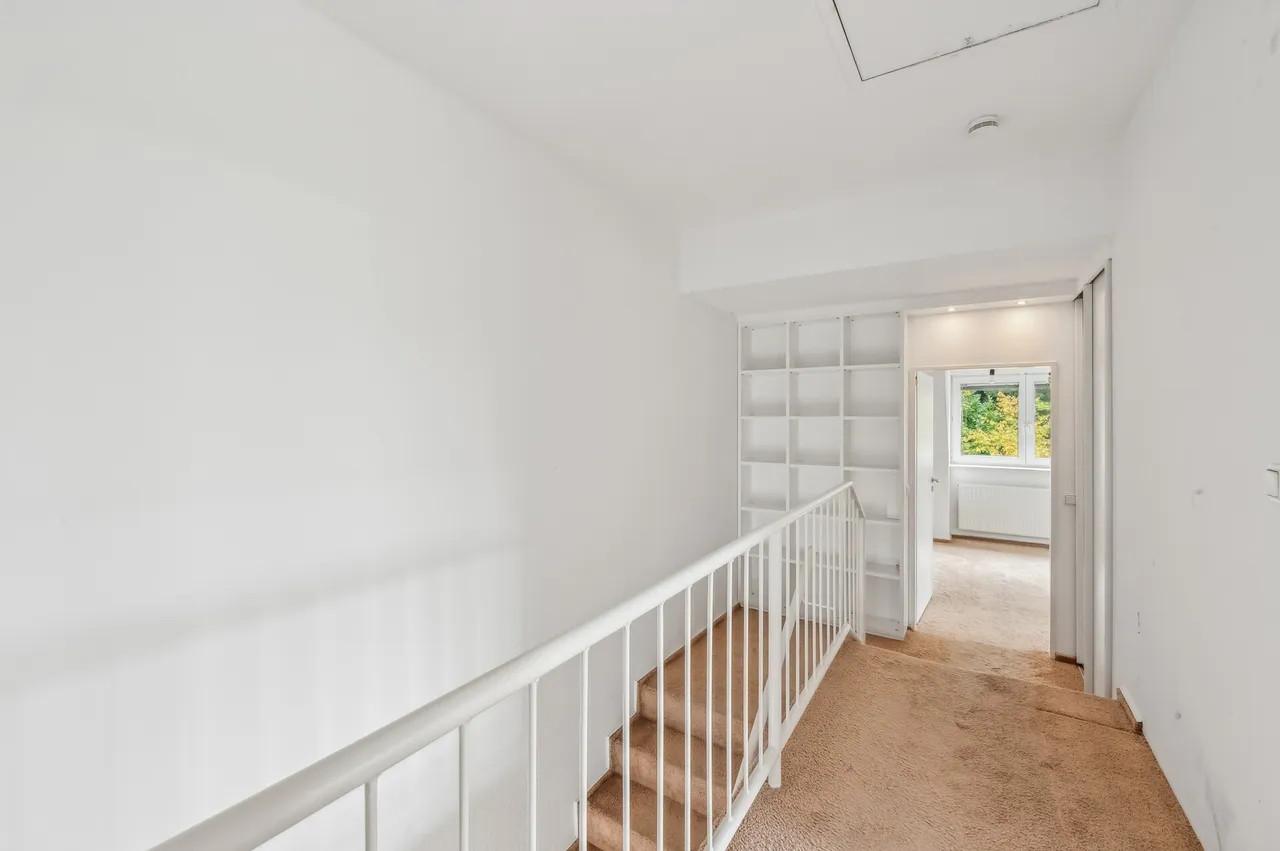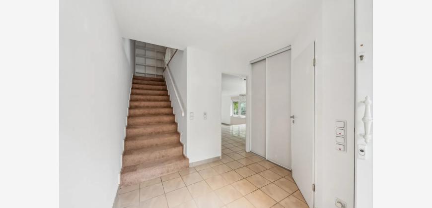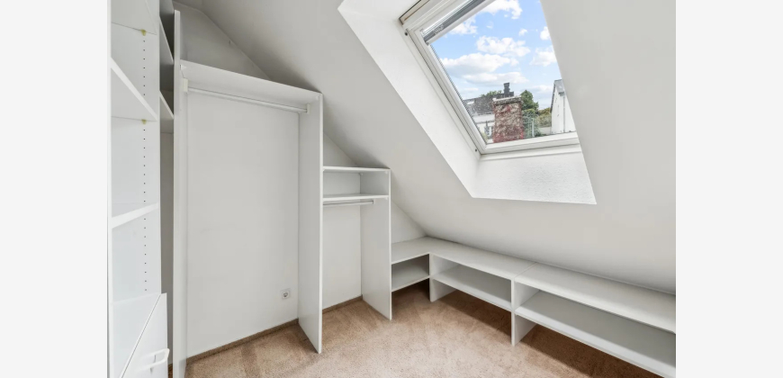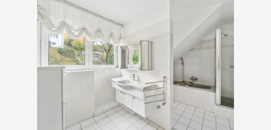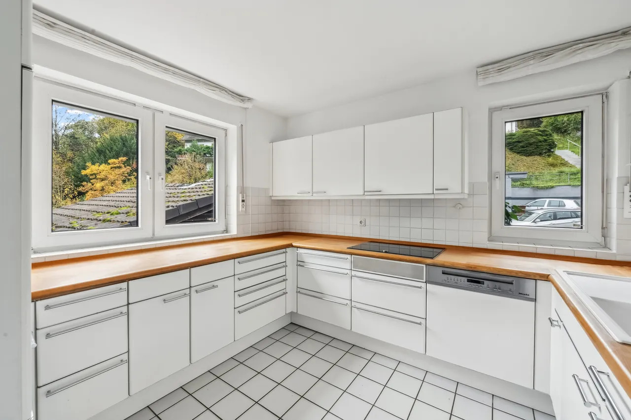 Diese Immobilie bietet eine tolle Raumaufteilung mit Wohnkomfort durch Blick ins Grüne. Schon beim Betreten des Wohnbereichs, welcher über einen großzügigen Flur erreichbar ist, wird man durch bodentiefe Fenster und die angrenzende Terrasse von diesem Blick überzeugt. Der groß geschnittene, offene und helle Wohn- und Essbereich bietet Platz für die ganze Familie. Die angrenzende Küche der Marke Poggenpohl ist zusätzlich mit hochwertigen Elektrogeräten der Marke Neff ausgestattet. Helle Fliesen runden das Gesamtbild im Erdgeschoss ab. Im Dachgeschoss verbindet ein Flur alle weiteren Räume. Dazu zählt auch das große Badezimmer, welches sowohl eine Dusche als auch eine Badewanne bietet. Dieses Badezimmer, und auch das Gäste-WC im Erdgeschoss, sind mit Tageslichtfernstern ausgestattet. Die anderen Räume können beispielsweise als Kinder- und Schlafzimmer genutzt werden. Auf dieser Etage ist außerdem Teppichboden verlegt. Im Untergeschoss befindet sich ein weiterer beheizter Raum mit Teppichboden, welcher problemlos als Büro genutzt werden kann. Im Heizungsraum nebenan befindet sich zudem die Sauna. Die Fenster im gesamten Haus und die Heizung stammen aus dem Baujahr des Hauses (1991). Außerdem ist eine Fußbodenheizung verlegt. Im Dachgeschoss bietet ein Dachspeicher zusätzlichen Stauraum, wobei die Decke für ideale Energieeffizienz gedämmt ist. Das Inventar wird durch ein zusätzliches Entgelt in Höhe von 10.000,00 € als Aufschlag auf den Kaufpreis berechnet. Dazu zählt: - eine Infrarotlichtsauna - Einbauschränke der Marke Interlübke - Einbauküche mit Elektrogeräten u. a. von Marken wie Miele und Neff