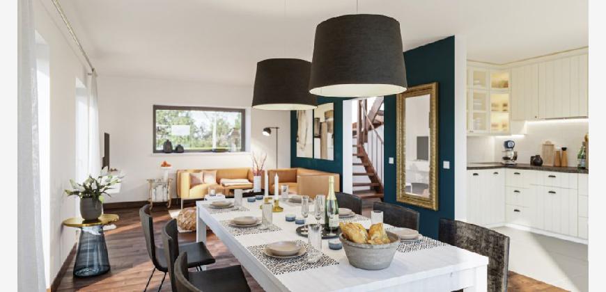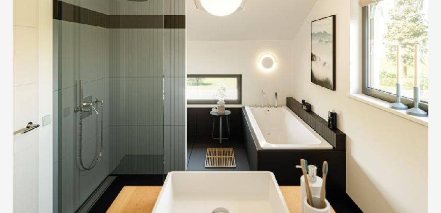 Im Erdgeschoss erwartet Sie ein geräumiges Wohnzimmer mit großen Fenstern, die viel Tageslicht hereinlassen. Die offene Küche bildet das Herz des Hauses und ist ideal für das gesellige Beisammensein. Das Esszimmer bietet Platz für gemeinsame Mahlzeiten und Feierlichkeiten.