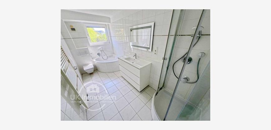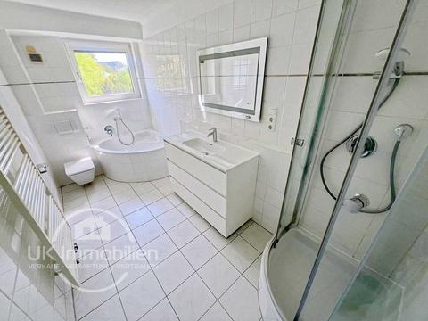 - Tageslichtbad mit Eck-Badewanne, Dusche mit Echtglasduschkabine, Handtuchheizkörper, beleuchteter Spiegel, breiter Waschtisch mit Schubladen