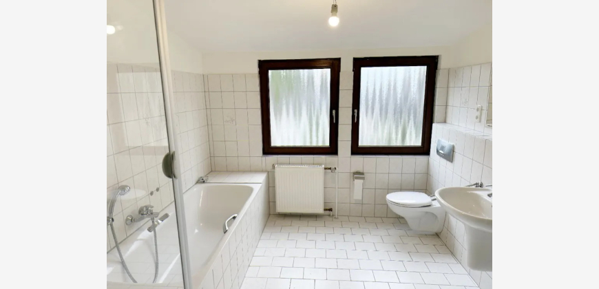 - Großes Badezimmer mit Wanne, Dusche und Fenster