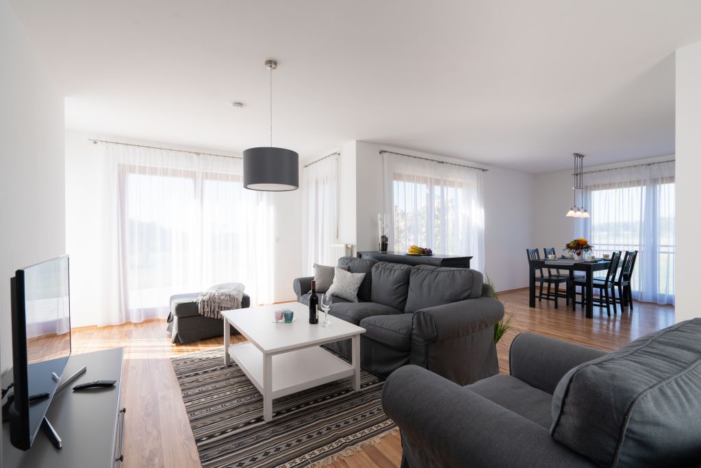 The bright and quiet 4-room apartment is located in the outskirts of a two-family house.The large living room / dining room area offers optimal conditions to hold meetings away from the office hectic.FURNISHING The living room consists of a dining room table with 4 chairs and a comfortable couch area, as well as a TV. The kitchen is equipped with everything needed for daily life (fridge, freezer, dishwasher, microwave, oven, induction hob, kettle, coffee maker, toaster). Shower, bath, 2 sinks, toilet and towel radiators form the bathroom, which is heated with underfloor heating. The bedroom has a double bed (180x200), two bedside tables and a three-door wardrobe.** Please note, there is a strict no smoking policy, both in the apartment and on the balcony **Notice: Displayed prices and data are not final, and should be used for informative purpose only. They are not contractual or binding. Energy pass Certificate type: : Year of construction: 2008 Efficiency class: C Energy consumption: 83.6kWh / (m²a)