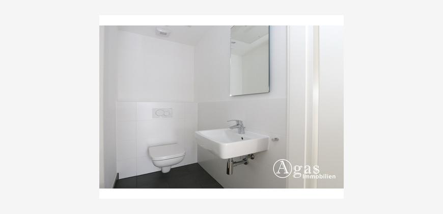 Das Hauptbadezimmer beeindruckt mit modernen Bodenfliesen und vermittelt eine zeitlose Eleganz. Ausgestattet mit Fußbodenheizung und Badewanne, bietet es einen angenehmen Ort zum Entspannen nach einem langen Tag. Zusätzlich steht ein separates Gäste-WC zur Verfügung.