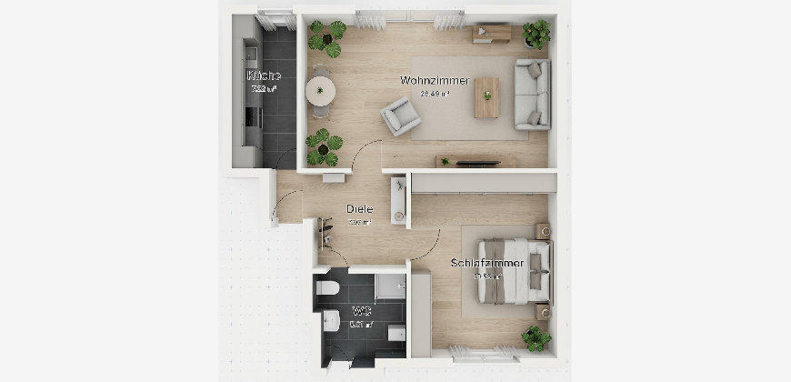 • 2 Zimmer: Wohnzimmer, Schlafzimmer, kleine Diele, Küche, Tageslichtbad
