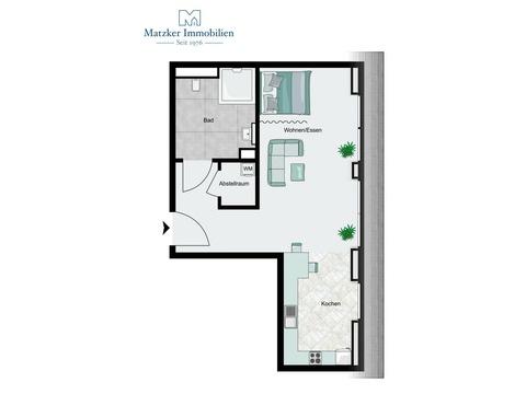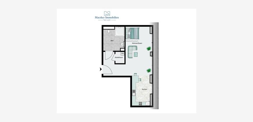 Der Schlafbereich kann geschickt abgetrennt werden und sorgt für eine klare Raumstruktur sowie ein angenehmes Wohngefühl. Das modern ausgestattete Badezimmer verfügt über eine bodengleiche Dusche und hochwertige Sanitärobjekte. Ein praktischer Abstellraum innerhalb der Wohnung ergänzt das Raumangebot sinnvoll.