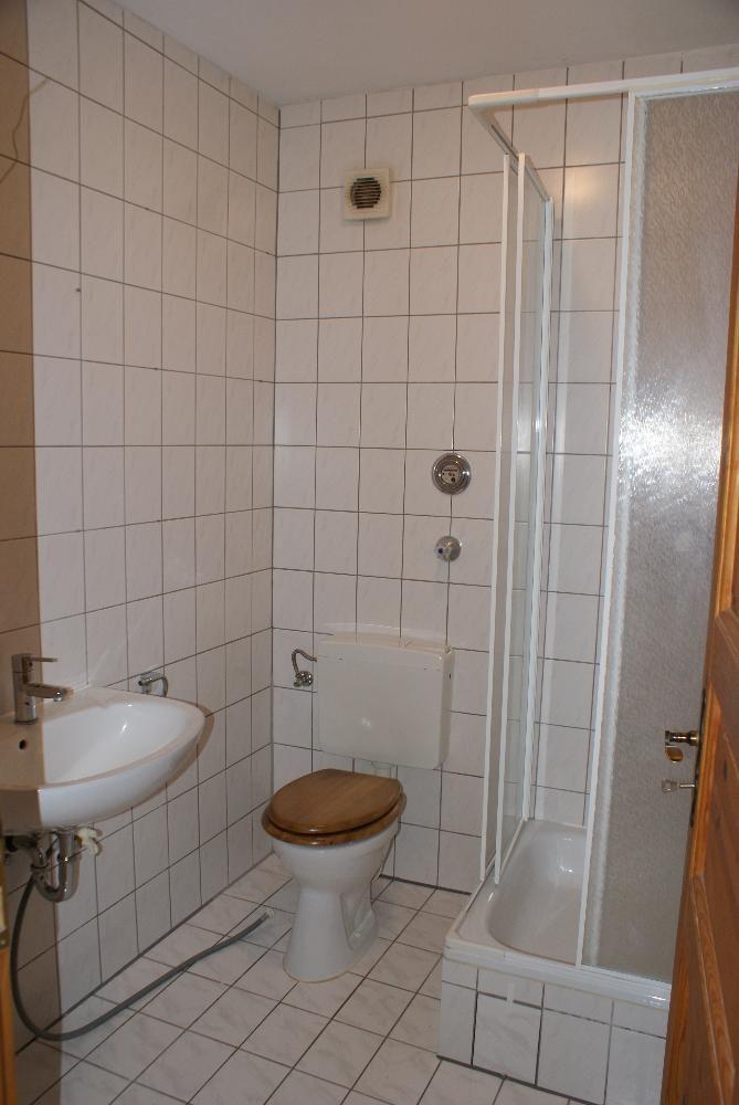 Das innenliegende Bad hat eine Dusche, WC und Waschbecken. Auch eine Waschmaschine passt in das Bad.