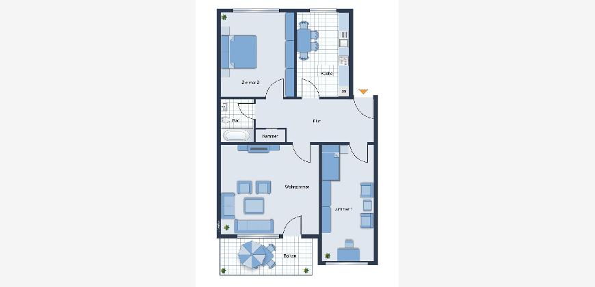 Es erwartet Sie ein großzügiger Flur, von dem alle drei Räume sowie die Küche und das Bad abgehen.