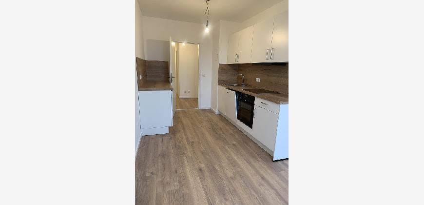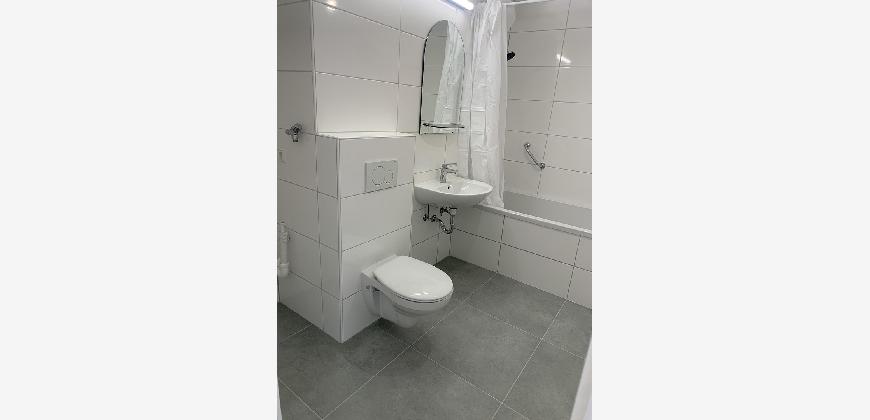 Besonderes Augenmerk verdient die neue Einbauküche, die mit weißen Fronten und einer Arbeitsplatte in Holzoptik ausgestattet ist. Ein modernes Cerankochfeld sowie ein neuer Backofen sind bereits integriert und sofort einsatzbereit. Das Badezimmer wurde ebenfalls vollständig runderneuert: Es verfügt über eine Badewanne, neue Sanitärobjekte und ist mit großformatigen Wandfliesen sowie einem Boden in dunkler Steinoptik modern gestaltet.