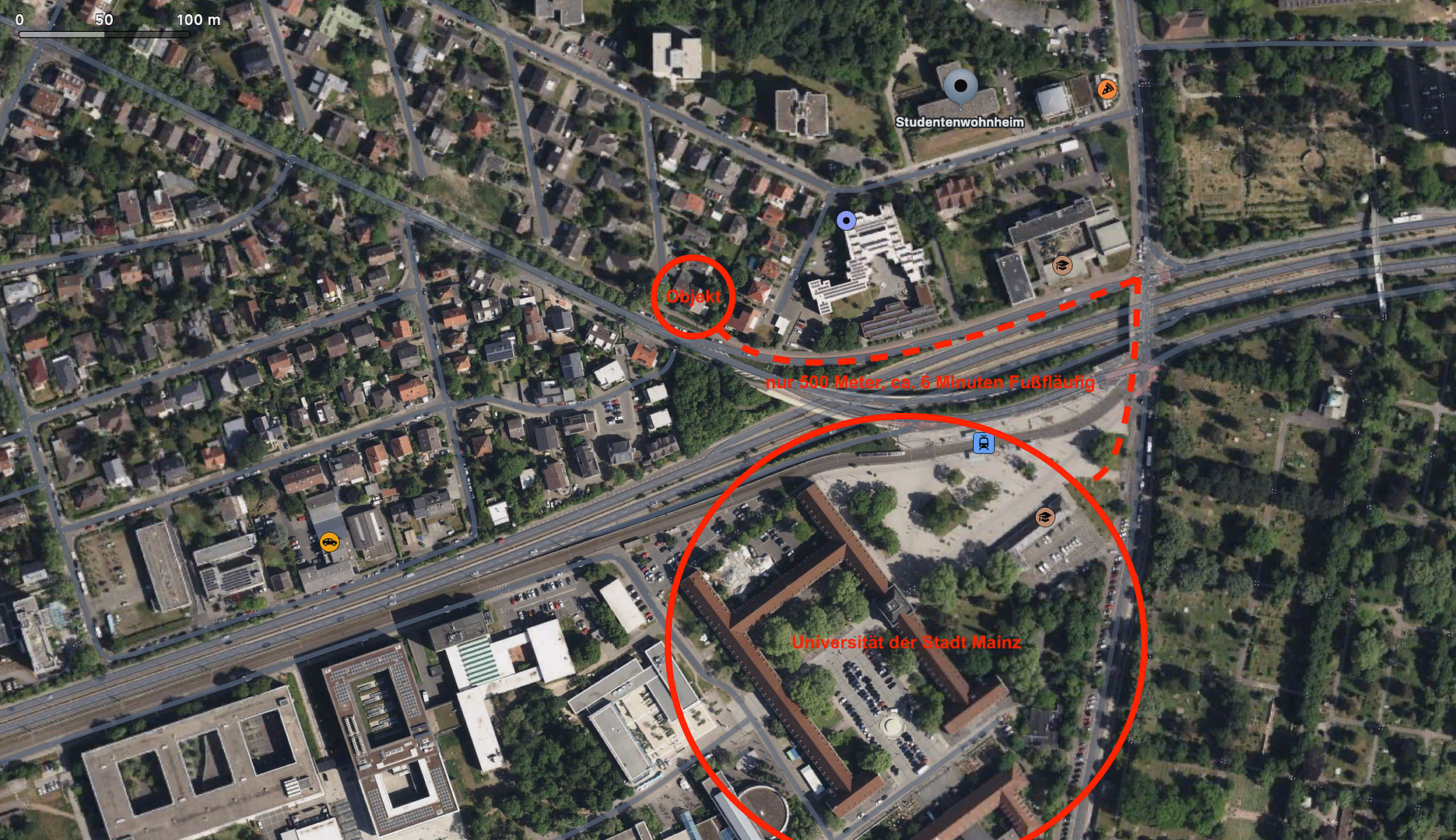 Die Wohnung befindet sich in hervorragender Lage – nur wenige Minuten von der Universität entfernt. Die gute Anbindung an öffentliche Verkehrsmittel (Bus und Bahn) und die Nähe zu Einkaufsmöglichkeiten, Cafés und Freizeitangeboten machen diese Lage besonders attraktiv für Studierende.