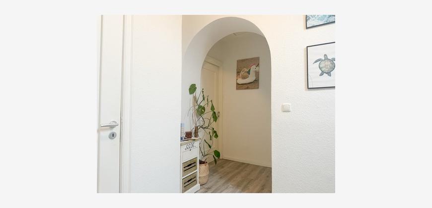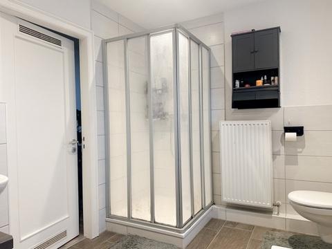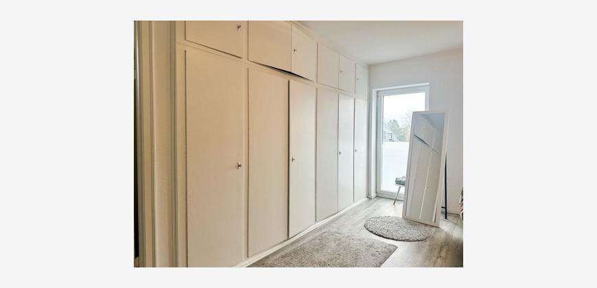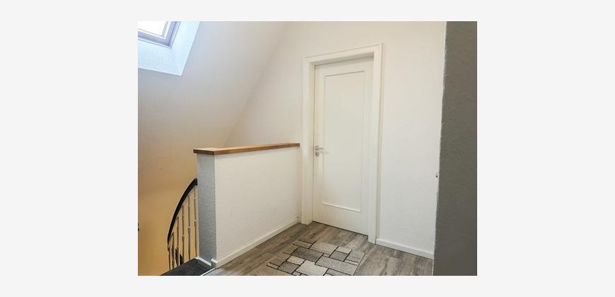 Eine Holztreppe führt in das Obergeschoss, wo sich drei weitere Zimmer befinden, darunter das geräumige Hauptschlafzimmer mit praktischen Einbauschränken. Das Tageslichtbad ist mit Dusche und Badewanne ausgestattet. Ein separater Abstellraum bietet zusätzlichen Stauraum.