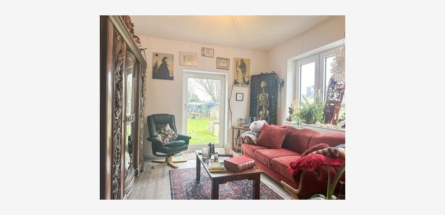 L-Form mit direktem Zugang zur Terrasse und in den Garten, perfekt für entspannte Abende. Ein zusätzliches Zimmer eignet sich hervorragend als Homeoffice, Gäste- oder Arbeitszimmer. Die Küche verfügt über eine separate Hintertür mit direktem Zugang in den Gartenbereich. Ein Gäste-WC rundet das Raumangebot im Erdgeschoss ab.