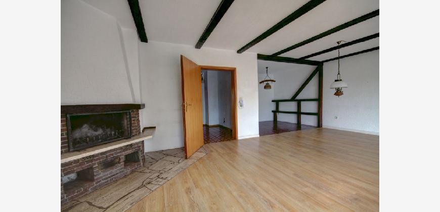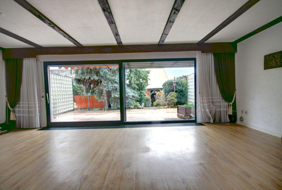 -Helles Wohn-/Esszimmer mit großer Fensterfront und Zugang zur sonnigen Terrasse/Garten sowie ein Kamin