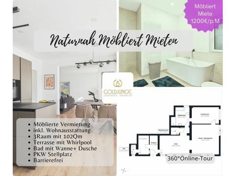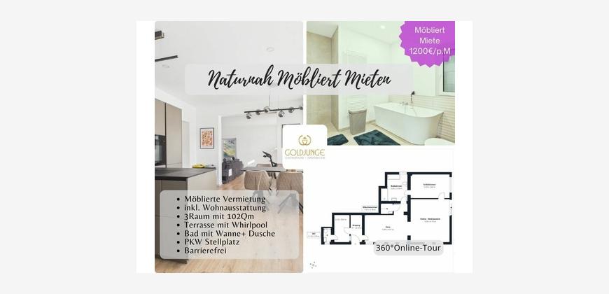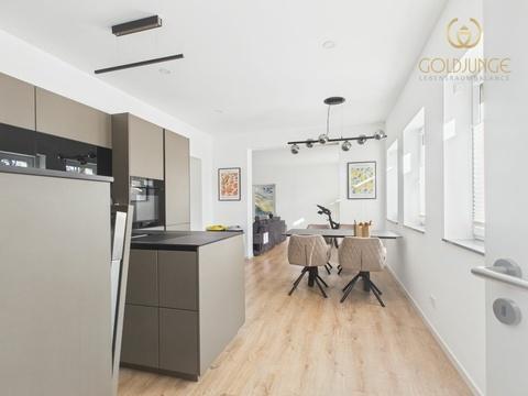 Sie wird zur befristeten Kurzzeitvermietung im vollständig möblierten Zustand angeboten. Zur Ausstattung gehören eine moderne Einbauküche, ein Essbereich, eine Wohnstube mit Couch und Sitzgelegenheiten, ein Einbauschrank sowie ein Doppelbett. Auch Gegenstände des täglichen Bedarfs, wie Reinigungstechnik und eine Waschmaschine, sind vorhanden.