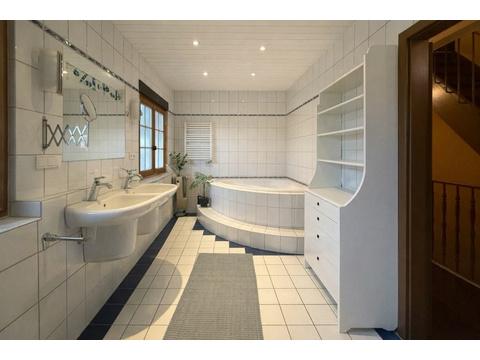 Das Obergeschoss bietet ein durchdachtes Raumkonzept mit 2 Schlafzimmern, eines davon mit Balkon. Ergänzt wird diese Ebene durch ein großes Tageslichtbad, ausgestattet mit Eckwanne und separater Dusche.