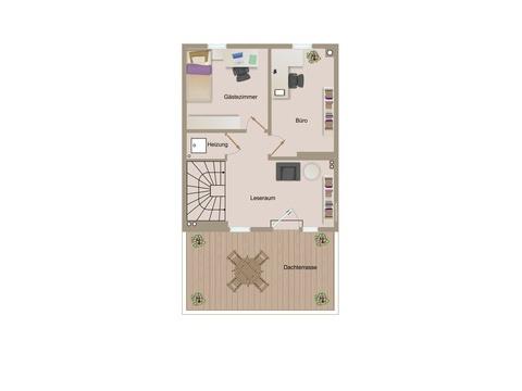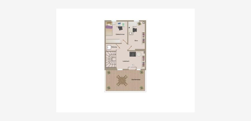 Im ausgebauten, lichtdurchfluteten Dachraum finden Sie zwei Räume (Büro, Gästezimmer etc.) sowie eine lichtdurfluteten Flurbereich zum relaxen. Die von hier aus erreichbare Dachterrasse ist nach Süden ausgerichtet und verfügt über eine elektrische Markise sowie einen seitlichen Havelblick.