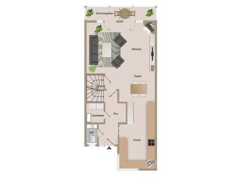 Im Erdgeschoss befindet sich das große Wohn-/ Esszimmer mit direktem Anschluss an die offene Küche. Über die große Fensterfront (bodentief) gelangt man auch zu der tollen verglasten Terrasse (Sommergarten) und dem schön angelegten, pflegeleiten Garten. Ein Gäste-WC sowie der praktische Hausanschlussraum, wo sich auch eine Wasserenthärtungsanlage befindet, runden das Erdgeschoss ab.