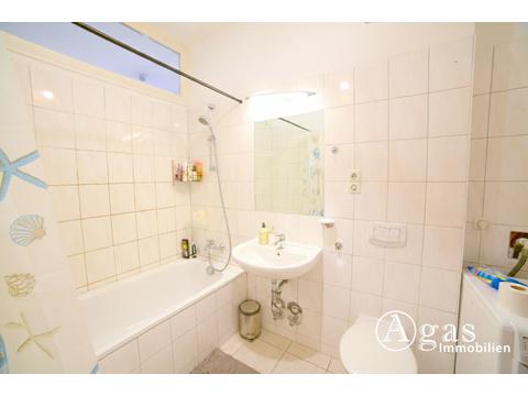 Das Badezimmer ist vollständig gefliest und mit einer Badewanne ausgestattet. Zusätzlich verfügt es über ein Fenster, das zur Küche hin angeordnet ist.