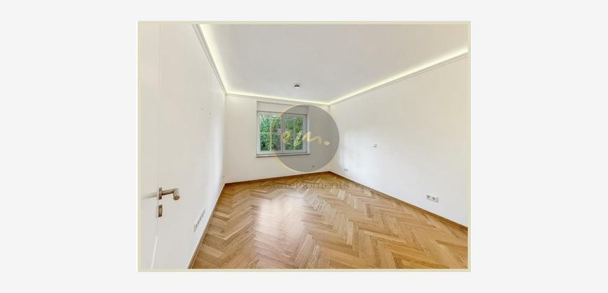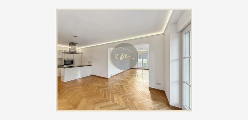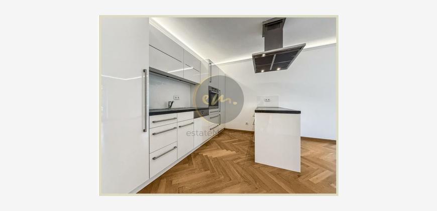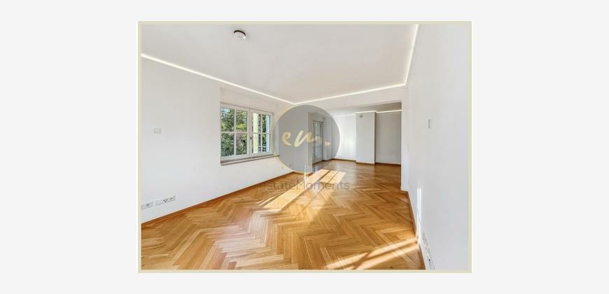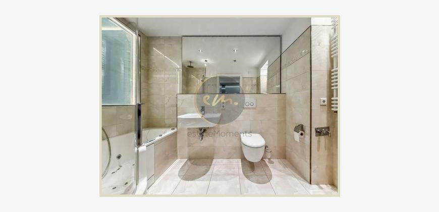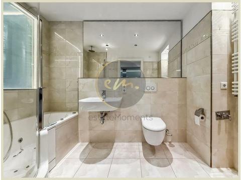 Die Wohnung ist mit hochwertigem Parkett ausgestattet, zusätzlich sorgt indirekte Deckenbeleuchtung in Wohn-, Schlaf- und Küchenbereichen für ein stimmungsvolles Ambiente. Die offene Küche ist zweckmäßig geschnitten und lässt sich perfekt in das Wohnkonzept integrieren.