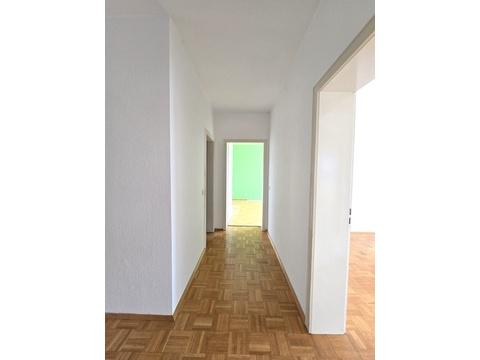 Die Fußböden in Wohnzimmer und Schlafzimmer sind mit echtem Stäbchen-Holzparkett ausgestattet, der Küchenboden ist aktuell mit PVC belegt, im Bad befinden sich Fliesen.