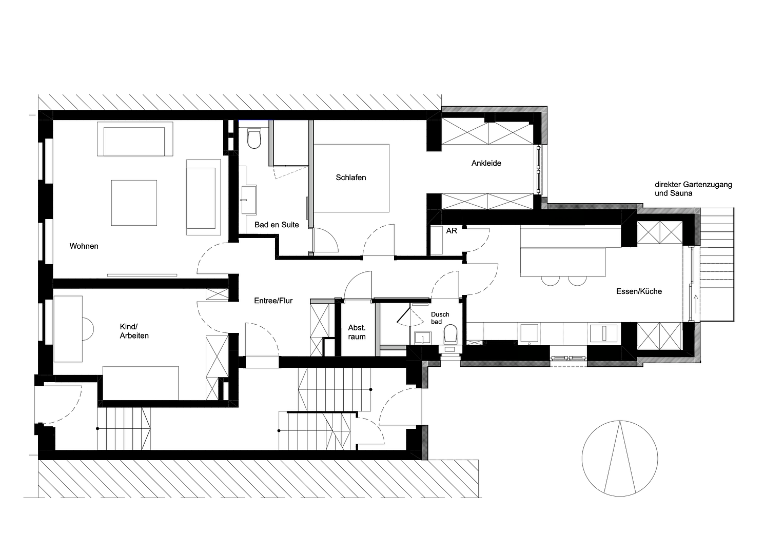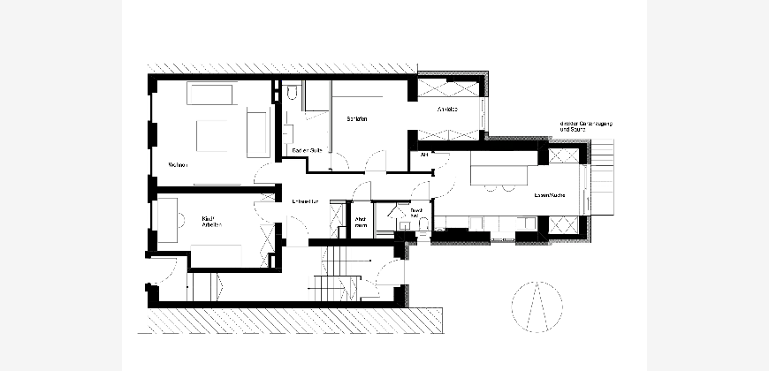 Ein Alleinstellungsmerkmal dieser Wohnung sind außerdem der direkte Zugang von der Küche zur Terrasse, der private Gartenbereich mit Geräteschuppen, der Zugang von Garten bzw. Terrasse zum Saunaraum, die eigene Waschküche mit Wäscheabwurf vom Schlafzimmer sowie der zusätzliche große Abstell- und Hauswirtschaftsraum im Keller.