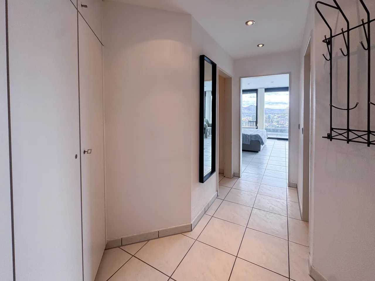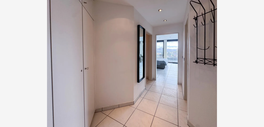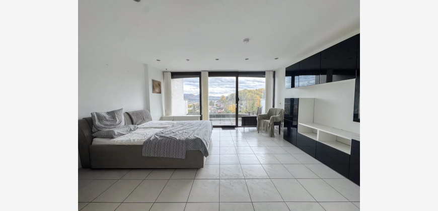 Das helle und großzügige Wohn-/Schlafzimmer ist ebenfalls möbliert und bietet ein komfortables Bett, geräumige Schränke und einen gemütlichen Sessel. Das Highlight der Wohnung ist der große Balkon mit atemberaubendem Blick ins Grüne – perfekt zum Relaxen.
