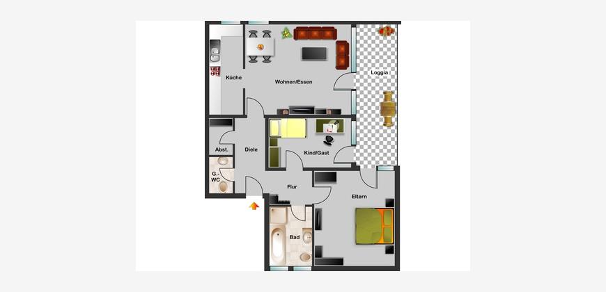 Eine sehr großzügige Wohnung im Obergeschoss eines Dreifamilienhauses. Aufgeteilt in Wohn-/ Esszimmer, Küche, Diele, Gäste-WC, Bad mit Wanne, Dusche und WC, Schlafzimmer, Gäste-/ Arbeitszimmer und Abstellraum. Angrenzend an Wohn-/ Esszimmer, Schlafzimmer und Gäste-/ Arbeitszimmer befindet sich ein sehr geräumiger Balkon. Ein separater Kellerraum sowie ein gemeinschaftlicher Waschkeller sind ebenfalls vorhanden. Ein zur Wohnung gehörender Kfz-Stellplatz (monatlich € 20,00) befindet sich direkt vor der Wohnung.