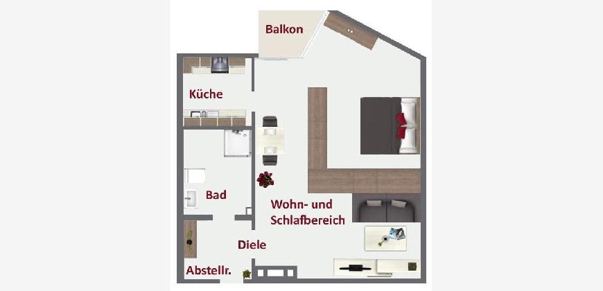 Ein Wohn-/ und Schlafbereich, ein Abstellraum, ein Badezimmer und ein abgetrennter Küchenbereich finden hier ihren Platz. Zusätzlich verfügt die Wohnung über einen Balkon, welchen Sie vom Wohn-/ und Schlafbereich aus begehen können.