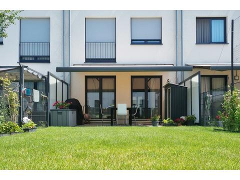 AusstattungDiese stilvolle Immobilie überzeugt durch ihre durchdachte Ausstattung sowie Raumaufteilung und bietet zahlreiche Annehmlichkeiten für modernen Wohnkomfort. Der großzügige, helle Eingangsbereich bietet ein Gäste-WC und den Zugang zum großen Wohnbereich, der durch die offene Küche und den zusätzlichen Essbereich besticht. Der direkte Zugang zur Terrasse eröffnet den Weg zum eigenen Garten.