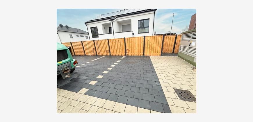 Zur Wohnung gehört ein eigener Stellplatz. Außerdem wird ein separates Gebäude für Fahrräder und Mülltonnen errichtet.
