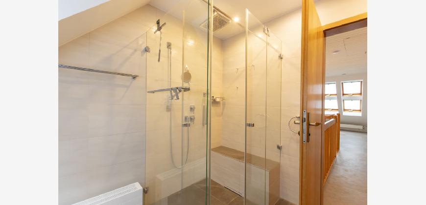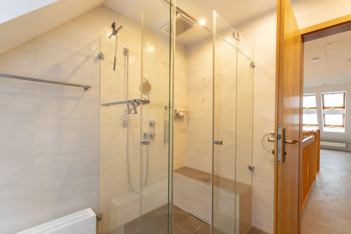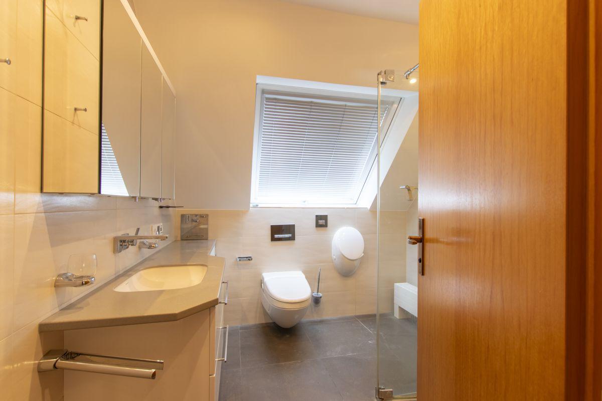 * Großes Bad mit bodengleiche Klarglasdusche, japanischer Toilette und Pissior