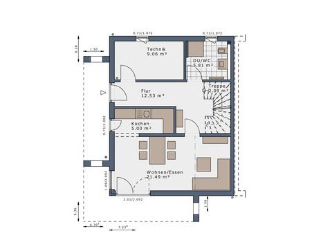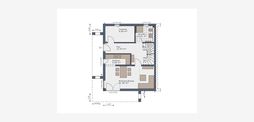 - Bodenplatte inkl. Effizienzhaus 55 Perimeter-Dämmung unterhalb der Bodenplatte sowie stirnseitig