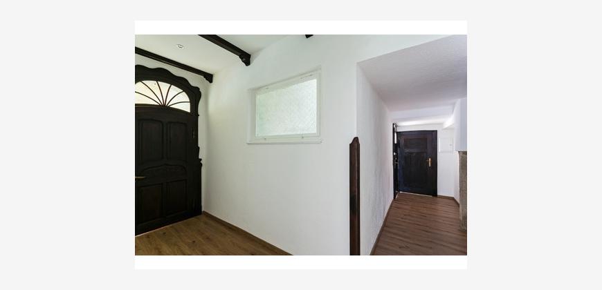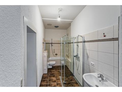 Das modern sanierte Bad mit Fenster ist türhoch gefliest. Badewanne, Dusche, WC und Waschbecken sind vorhanden. Für die Waschmaschine und das Gäste-WC stehen jeweils eigene Räume zur Verfügung.