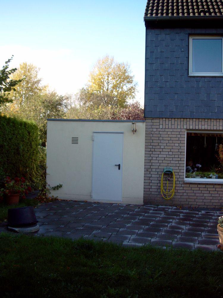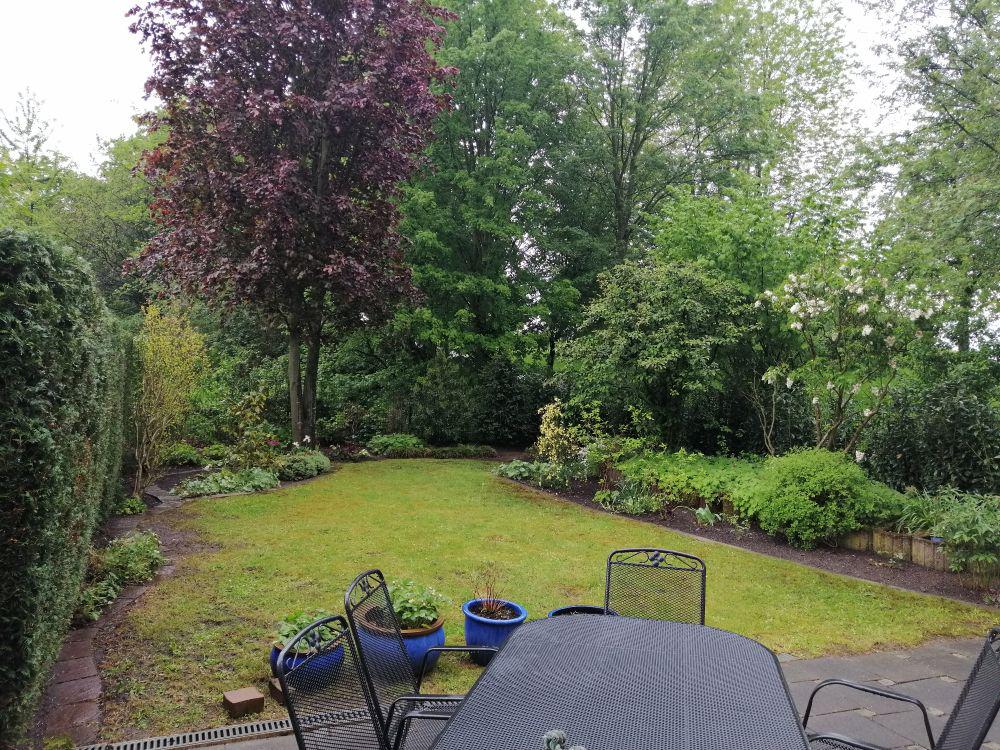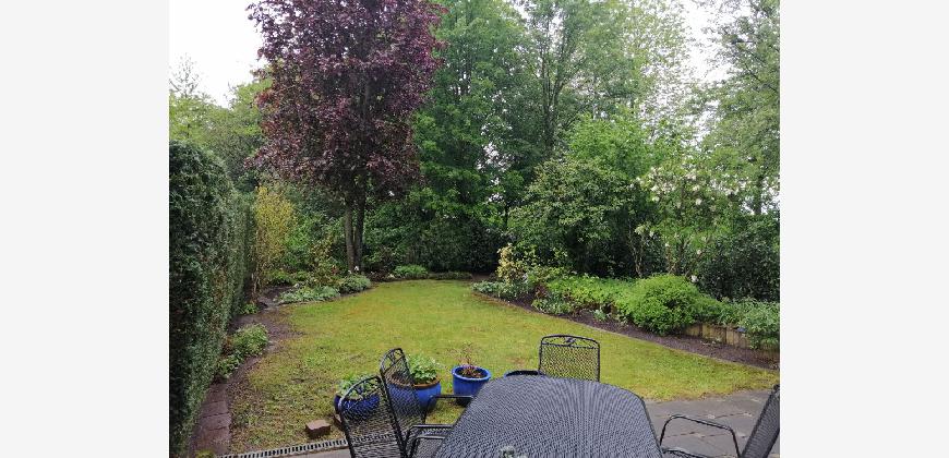 Vom Wohnzimmer aus gelangen Sie auf die großzügige Terrasse mit Markise und grünem Ausblick, auch in den dahinter liegenden Park. Angrenzend an die Garage ist ein Abstellraum für Gartengeräte, Fahrräder usw.. mit Durchgang zur Garage. Die Garage verfügt über ein elektrisch betriebenes Tor.