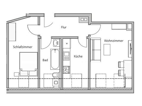 Die Wohnung umfasst zwei gut geschnittene Zimmer sowie ein stilvolles Tageslichtbad, das für eine angenehme Wohnatmosphäre sorgt. Die separate Küche bietet ausreichend Platz für individuelle Kochideen und kulinarische Entfaltung.
