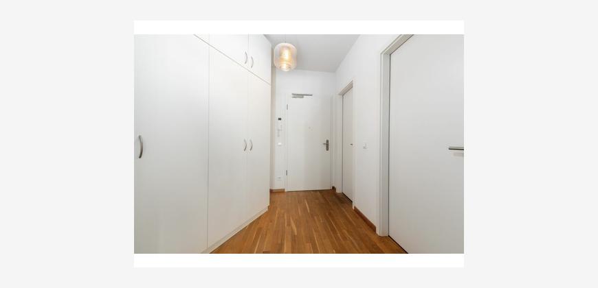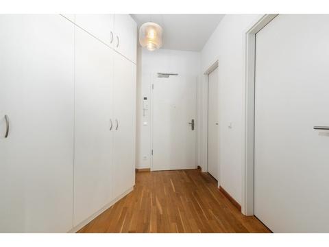 Herzstück der Wohnung ist der lichtdurchflutete Wohnbereich mit direktem Zugang zur Loggia – Ihr privater Freibereich mit Blick ins gepflegte Umfeld. Die durchdachte Raumaufteilung umfasst ein harmonisch proportioniertes Schlafzimmer, eine geräumige Diele mit praktischem Einbauschrank, einen separaten Hauswirtschaftsraum sowie ein elegantes Wannenbad. Hochwertige Materialien prägen das Ambiente: zeitloses Eichenparkett verleiht jedem Raum Wärme und Charakter, während die dreifach verglasten Holzfenster für optimalen Schallschutz und eine hervorragende Energiebilanz sorgen. Die Fußbodenheizung in allen Räumen schafft wohlige Wärme und sorgt für ein angenehmes Raumklima das ganze Jahr über. Ein moderner Aufzug bringt Sie bequem in alle Ebenen, Kellerabteil und Tiefgaragenstellplatz nach Verfügbarkeit erhöhen den Komfort zusätzlich. Die barrierearme Erschließung des Ensembles ist ein Plus für viele Lebensphasen.