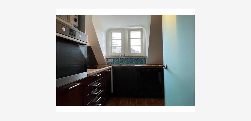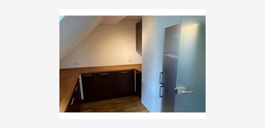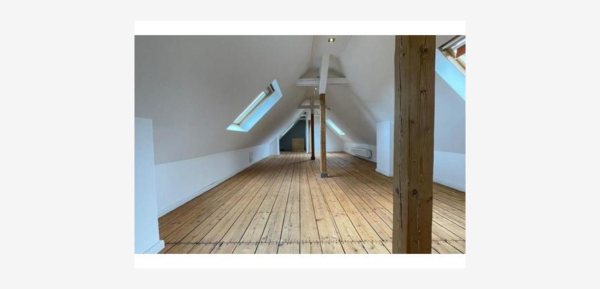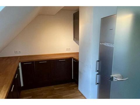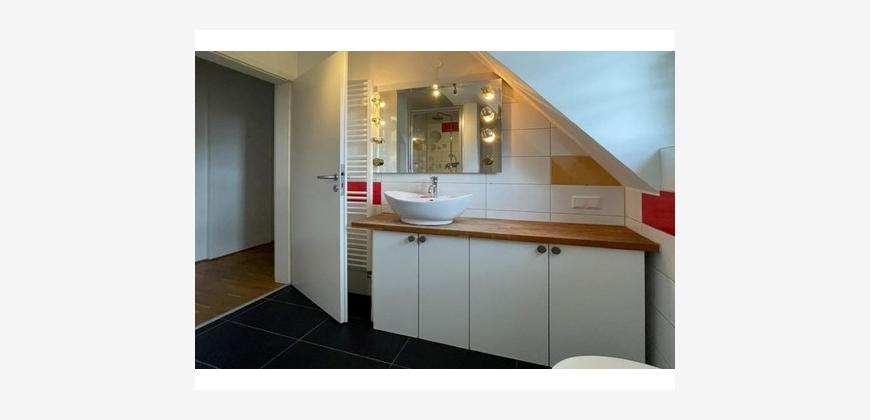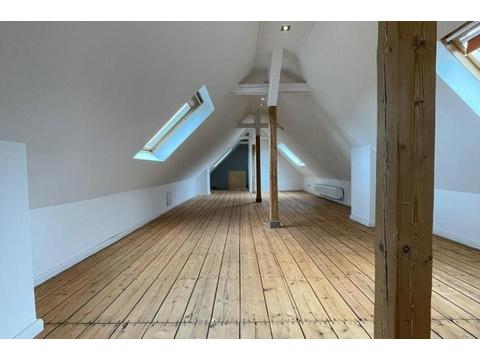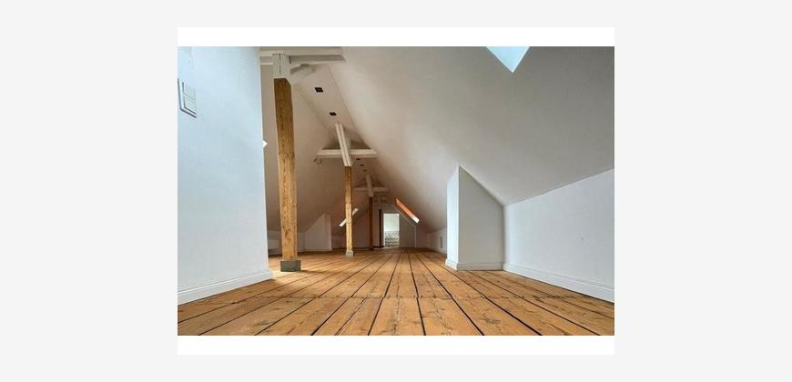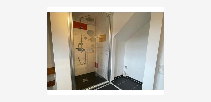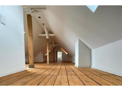 Diese helle Maisonette-Dachgeschosswohnung besticht durch ihre Großzügigkeit. Zur Linken der Wohnungstür befindet sich die Küche mit gut ausgestatteter Einbauküche, die mitvermietet wird. Gegenüber der Küche liegt das Wohnzimmer, das mit Ständerwerk optisch in zwei Bereiche unterteilt ist. Im hinteren Teil des Zimmers befindet sich der Kaminofen, der bei den hohen Heizkosten nicht nur für die romantische Atmosphäre dienlich ist. Zu guter Letzt befindet sich noch das Duschbad mit Regendusche und Waschmaschinenstellplatz auf der unteren Wohnungsebene. Über eine Holztreppe am Ende der Diele geht es ins Studio. Neben der Treppe befindet sich der Abstellraum, der als begehbarer Kleiderschrand genutzt werden kann. Das dort vorhandene Regalsystem und Kleiderstangen werden mitvermietet. Am Ende des Studio ist das Wannenbad mit bodentiefer Badewanne gelegen.