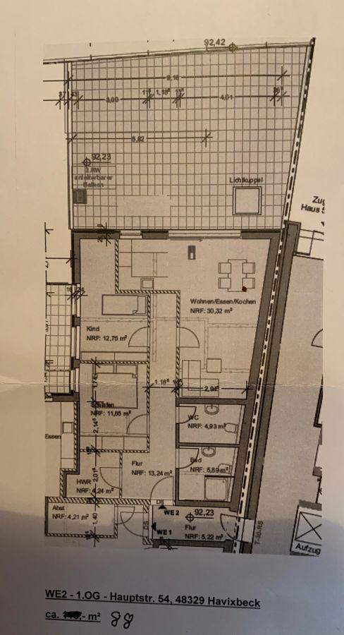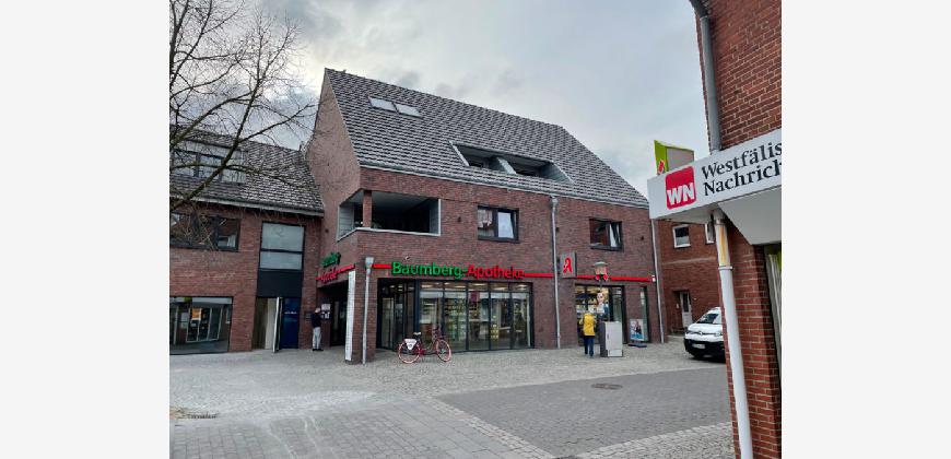 Die Wohnung liegt im ersten Obergeschoss eines neuwertigen Gebäudes im Zentrum der Gemeinde Havixbeck. Sie hat drei Zimmer, Küche, Diele, Bad, Gäste WC und einen hauswirtschaftlichen Raum . Zudem eine große Terasse. Es handelt sich um eine Wohnung im Zweitbezug. Neben schalldichten Fenstern ist eine Fußbodenheizung und eine umfangreiche Netzwerkinstallation eingebaut worden. Elektrische Rollläden sowie moderne Hausinstallation sind selbstverständlich vorhanden.