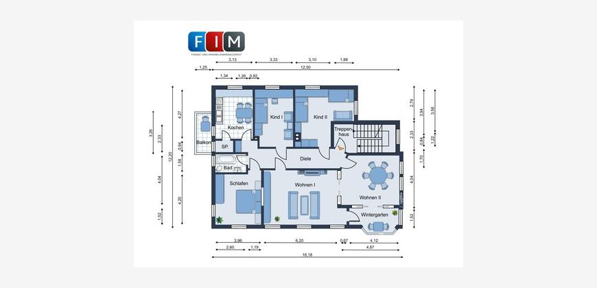 Schon die großzügige Diele empfängt Sie mit dem Gefühl von Weite und gibt den Blick frei auf die harmonisch miteinander verbundenen Wohnbereiche. Der weitläufige Wohn- und Essbereich bildet das Herzstück der Wohnung – ein Raum, der von Licht durchflutet wird und Platz für gemeinsames Leben schafft. Besonders eindrucksvoll ist der beheizte Wintergarten, der diesen Teil der Wohnung in eine ganzjährig nutzbare Wohlfühloase verwandelt. Hier kann man den Wechsel der Jahreszeiten erleben, ohne auf Behaglichkeit zu verzichten.