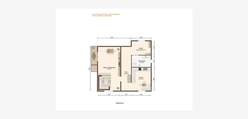 Im Erdgeschoss erwartet Sie ein offener Wohn- und Essbereich, der durch seine helle und freundliche Atmosphäre besticht. Von hier aus besteht Zugang zur Terrasse und zum kleinen Garten, der sich ideal für entspannte Stunden im Freien eignet.
