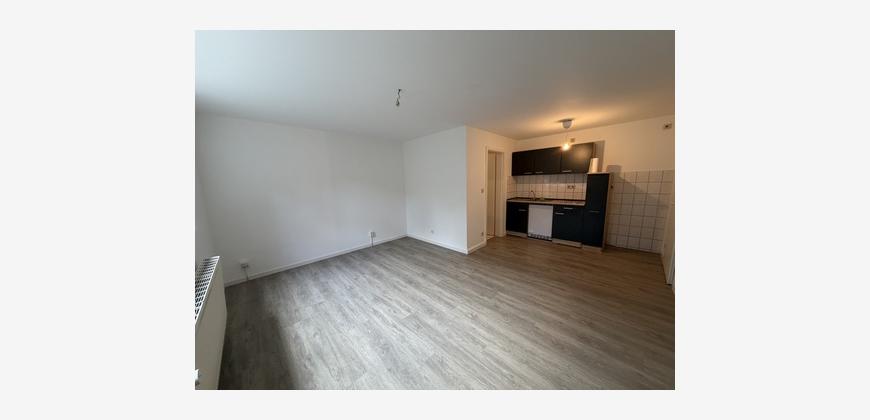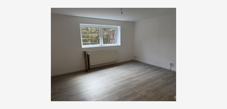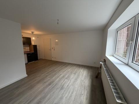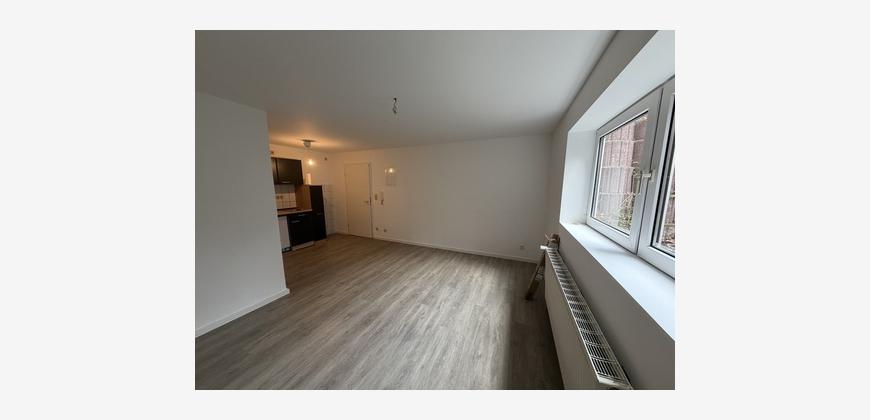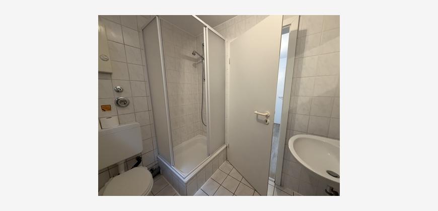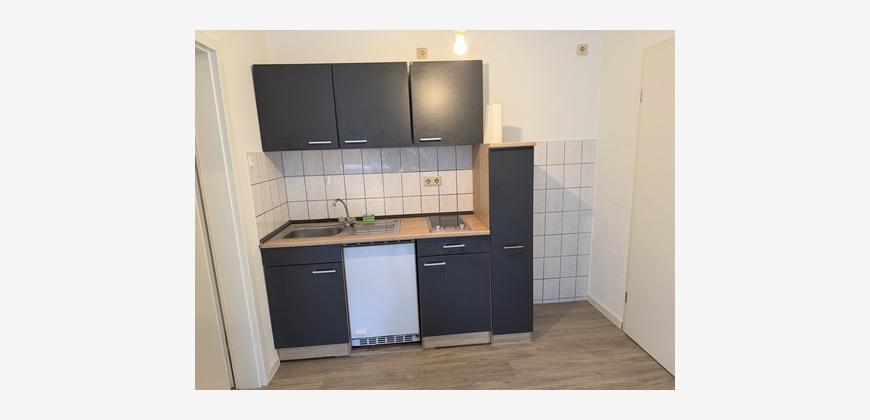 Die Nachbarschaft zeichnet sich durch sehr gepflegte Einfamilienhäuser auf Gartengrundstücken aus. Das Appartment liegt im Souterrain eines kleinen Mehrfamilienhauses mit viel Sonnenlicht durch den abgeböschten Vorgarten. Der ca. 24 m² große Raum ist mit einem Vinylboden in Holzoptik versehen. Eine kleine Einbauküche mit dunklen Fronten ist integriert. Das Duschbad mit Fenster ist klassisch weiß gefliest und mit einer Dusche ausgestattet.