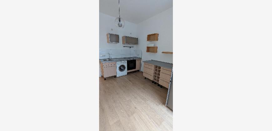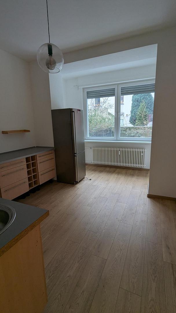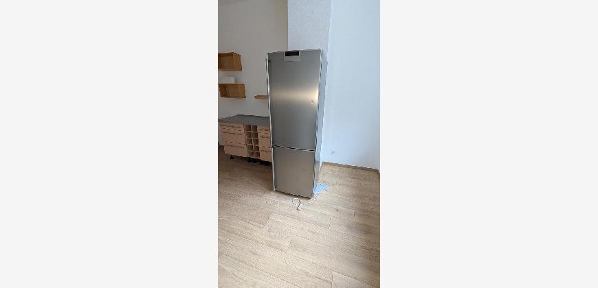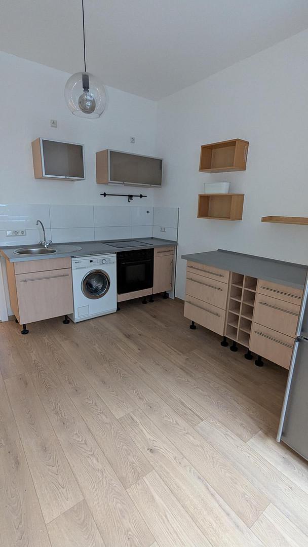 Küche mit Einrichtung (E-Herd, Waschmaschine, Kühlschrank)