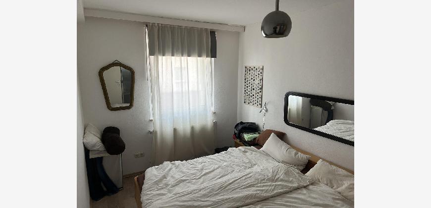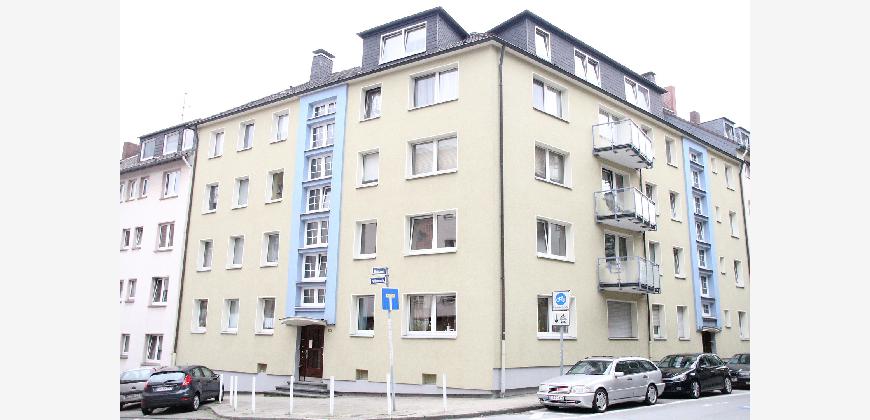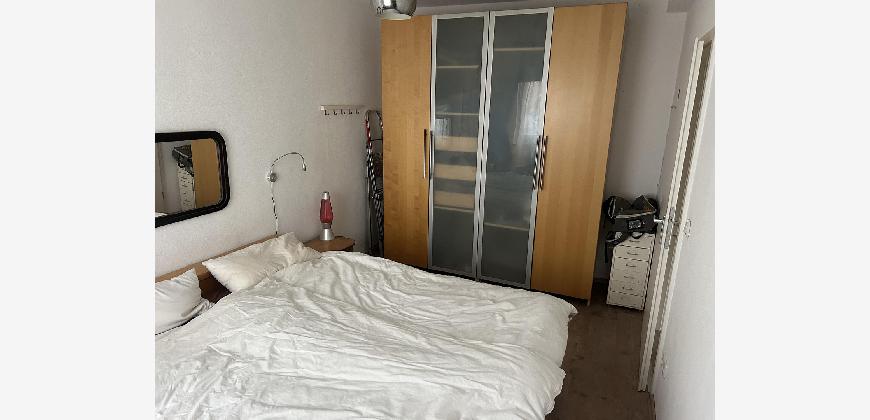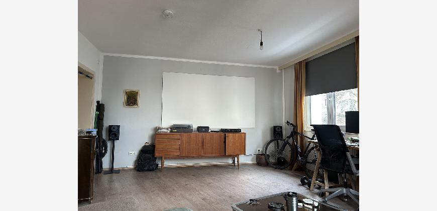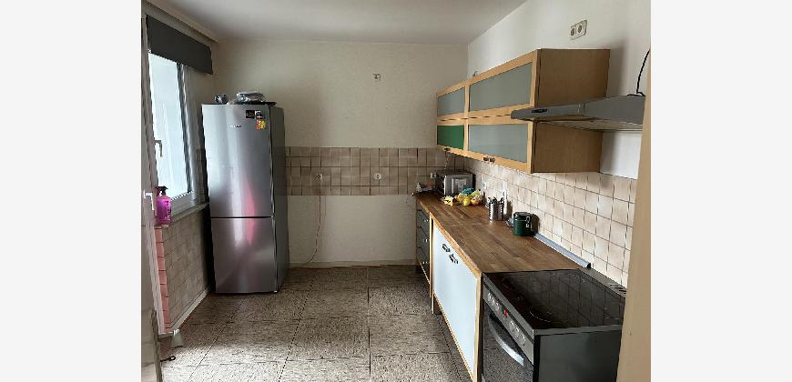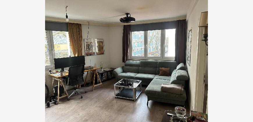 Für die Größe der Wohnung ist der Wohnraum sehr groß mit 2 x 2-flügeligen großen Fenstern. Auch die Wohnküche, von der man auf den Balkon gelangt ist sehr groß.