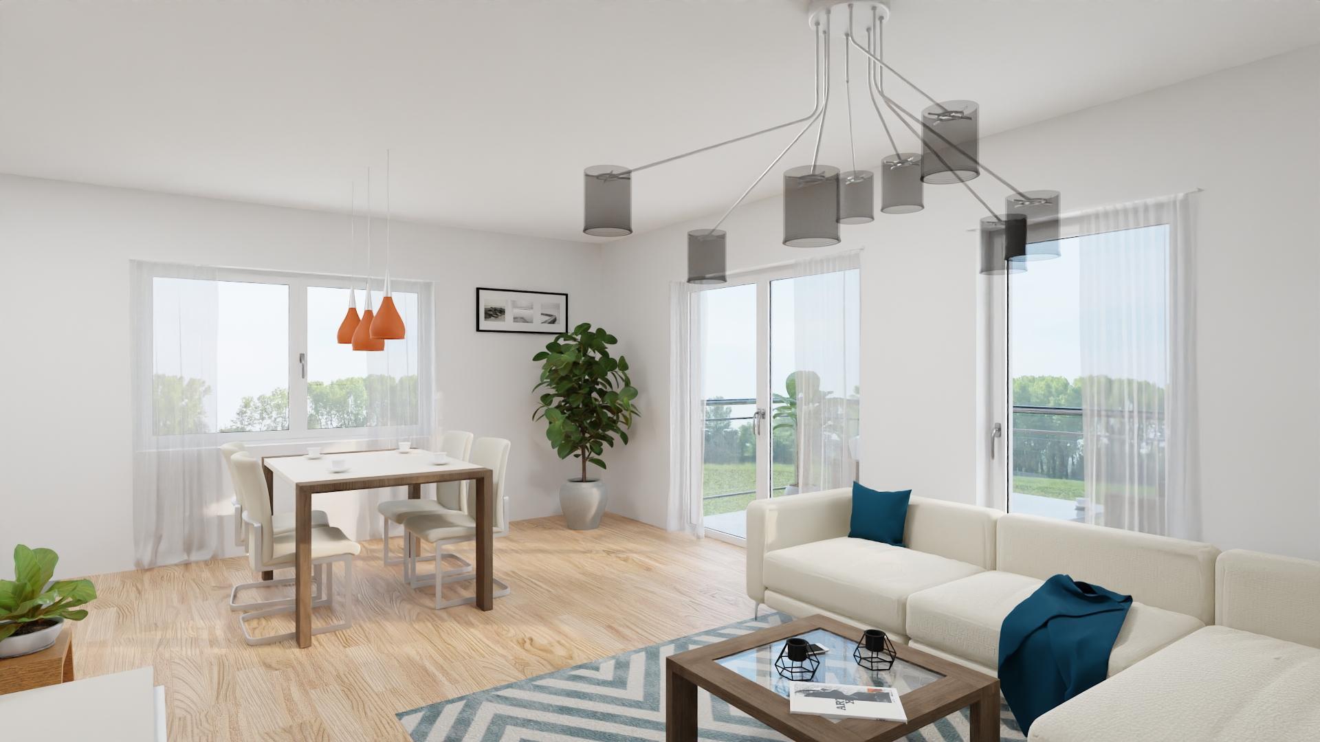 - Großzügiger und lichtdurchfluteter Wohn- und Essbereich mit bodentiefen Fenstern und Zugang zum sonnigen Balkon