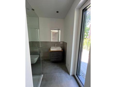 Ein separates Gäste -WC mit hochwertigen Armaturen, modernen Fliesen, einer ebenerdigen Dusche und bodentiefem Fenster ausgestattet, befindet sich im Erdgeschoss.