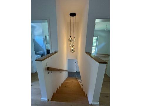 Hochwertiges Eichen-Echtholzparkett in Kombination mit geschmackvollen Fliesen verleihen dem Interieur eine warme, luxuriöse Ausstrahlung und bieten durch die Fußbodenheizung wohligen Wohnkomfort.